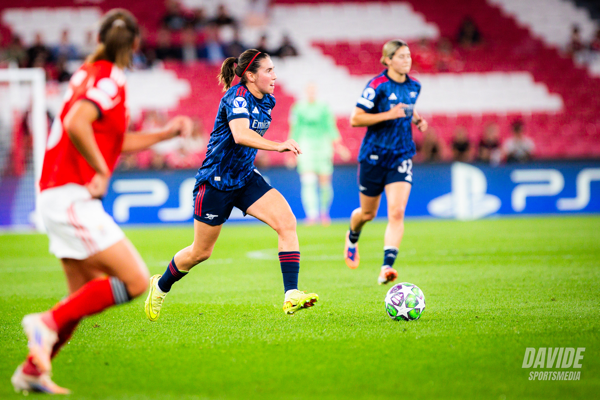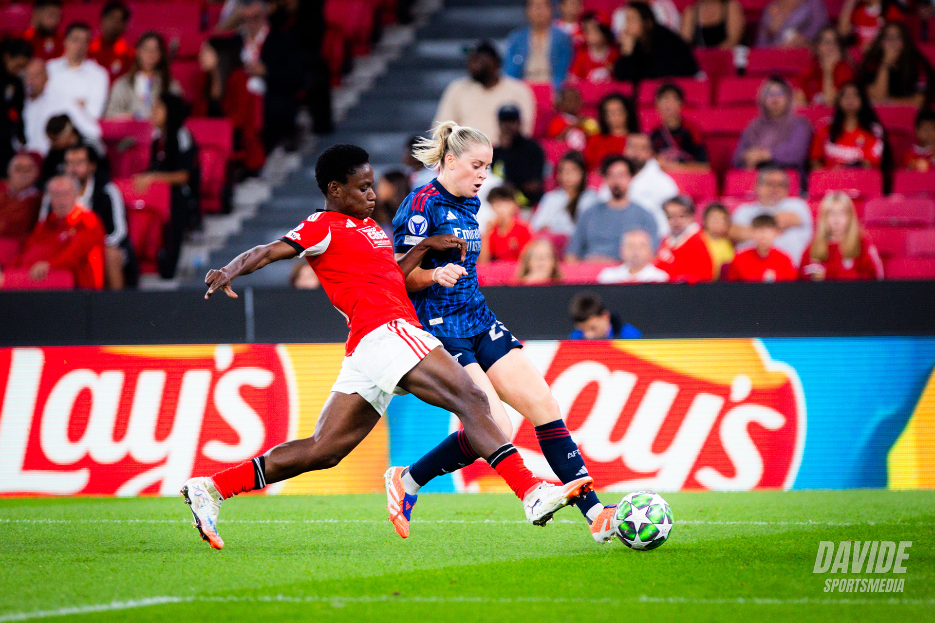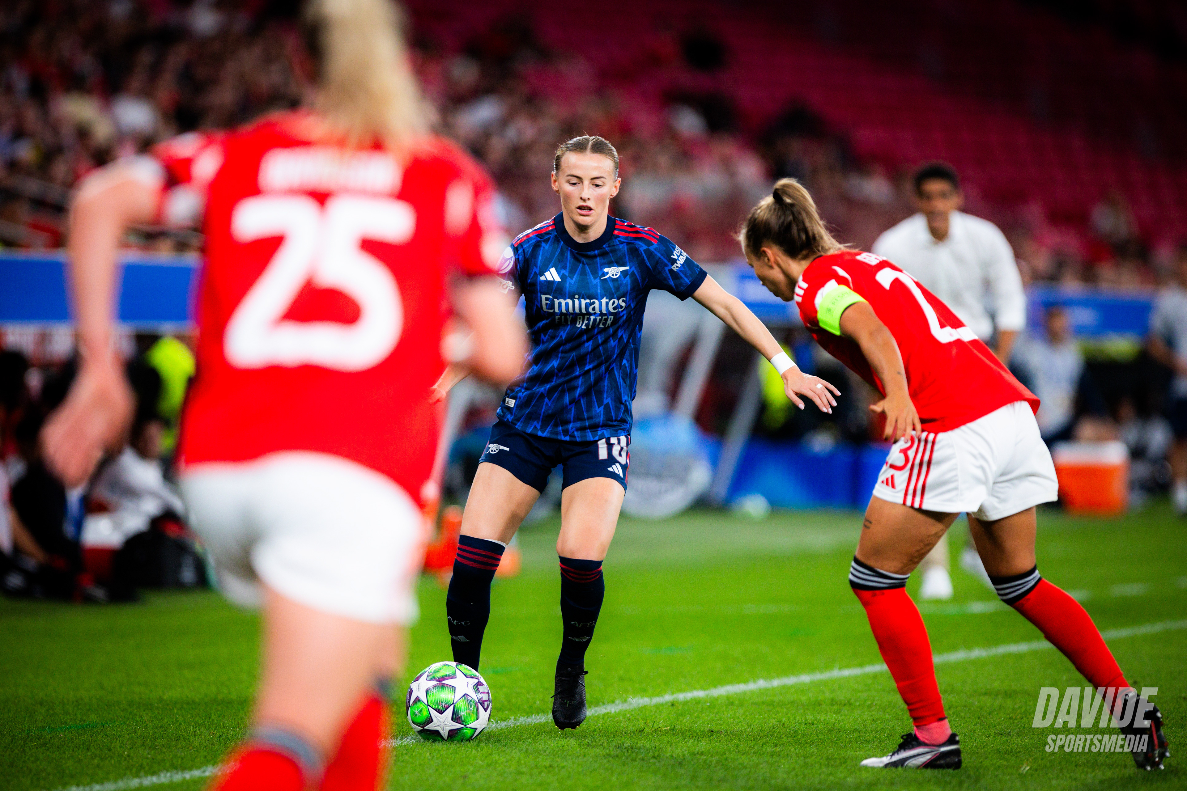 o Arsenal pressionou alto e tentou criar oportunidades logo no início do jogo, mas o Benfica conseguiu manter a organização defensiva e sair em alguns contra-ataques. Próximo do intervalo, o Benfica teve a melhor chance da primeira parte por parte de Diana Gomes.