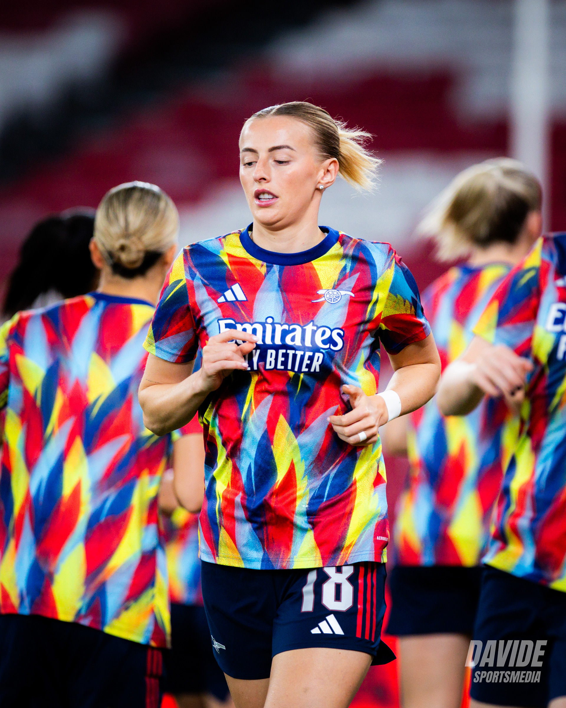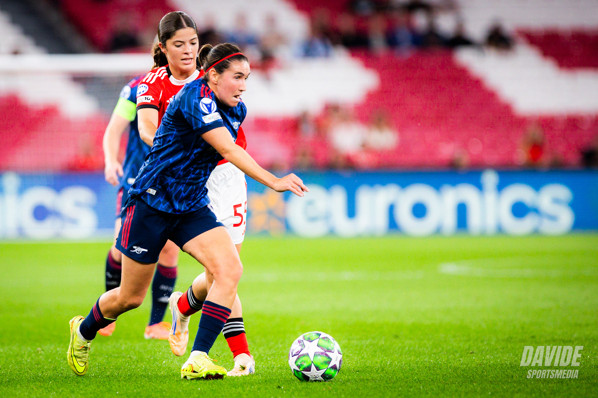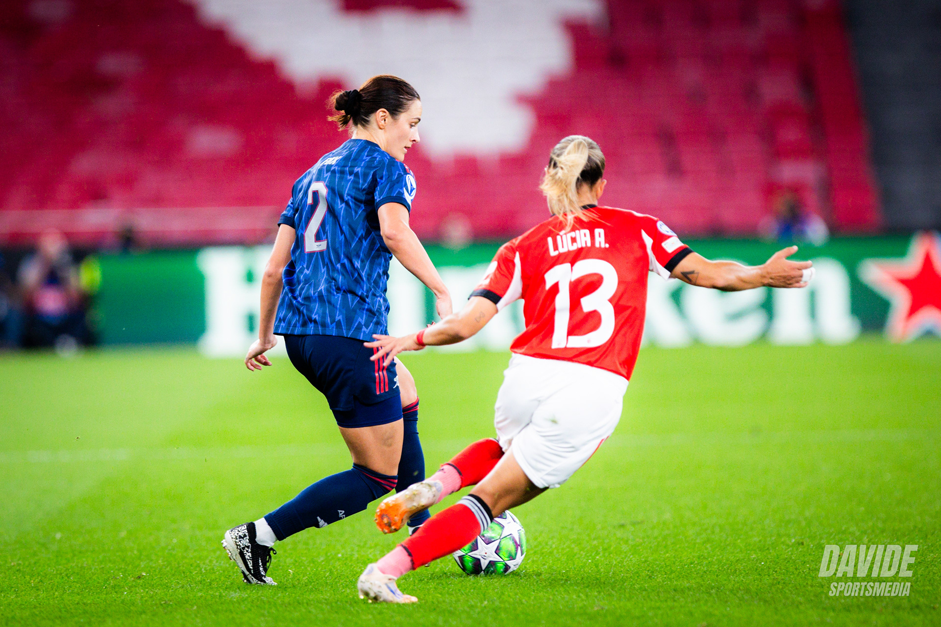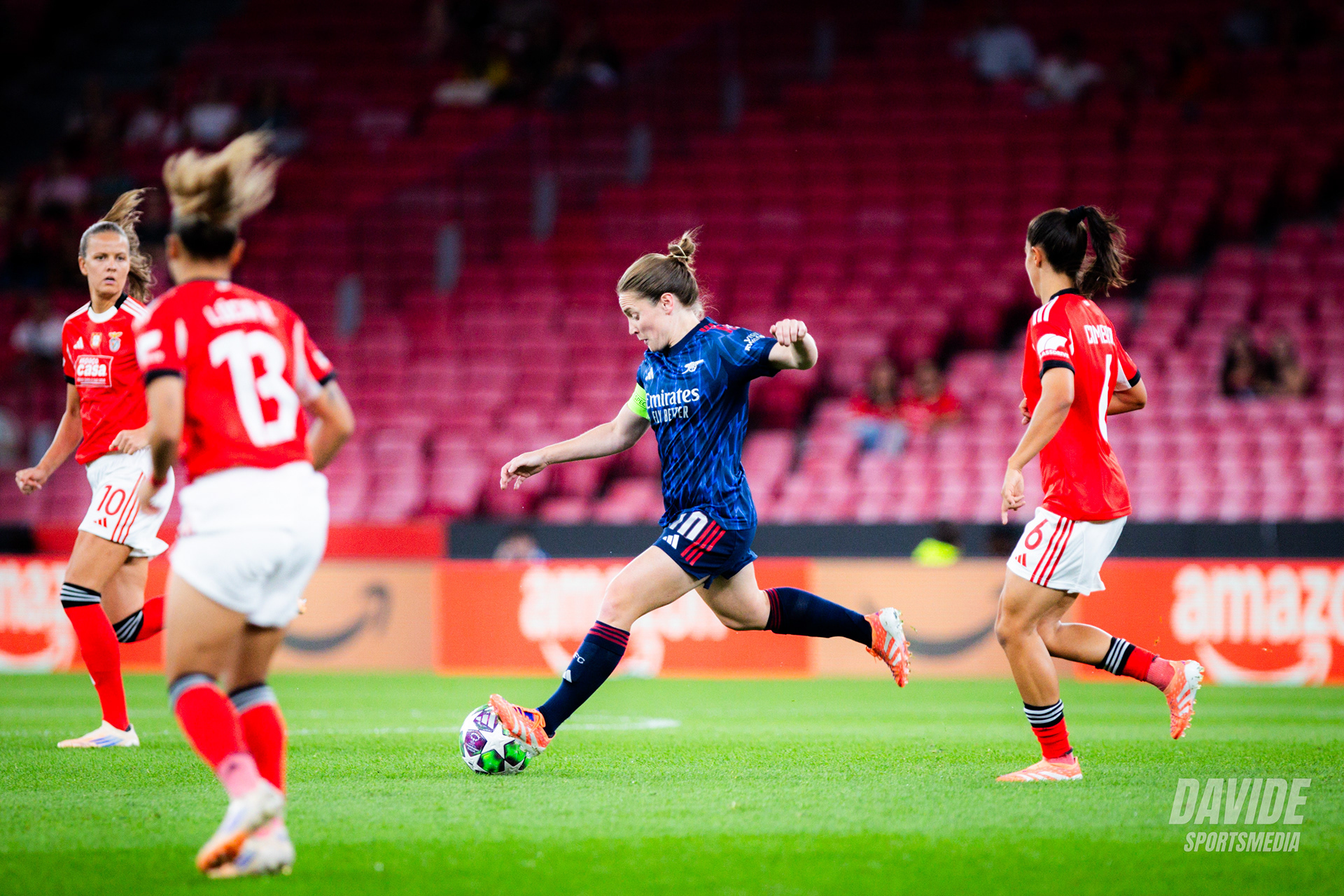 o Arsenal pressionou alto e tentou criar oportunidades logo no início do jogo, mas o Benfica conseguiu manter a organização defensiva e sair em alguns contra-ataques. Próximo do intervalo, o Benfica teve a melhor chance da primeira parte por parte de Diana Gomes.